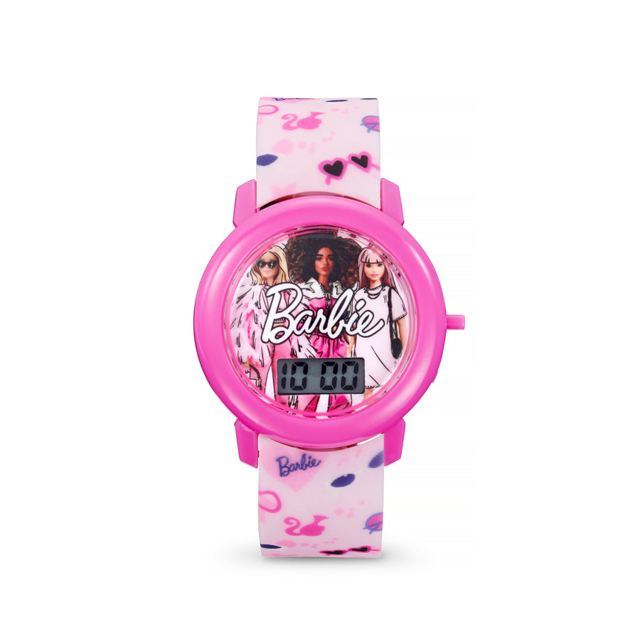 This cute Barbie® watch is perfect for both children and adults. The digital watch face features three iconic Barbie dolls overlaid with the classic Barbie® logo. A rubber light pink strap, covered in playful Barbie doodles, adds a pop of colour to your wrist. Taken from the official Barbie® range - perfect for every fan.