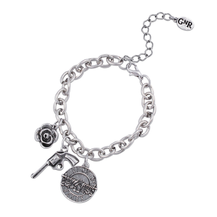 This bracelet from the official Guns N' Roses range includes three charms... a GNR Logo Disc charm, Gun charm and a Rose charm. This product is Antique Silver plated base metal.