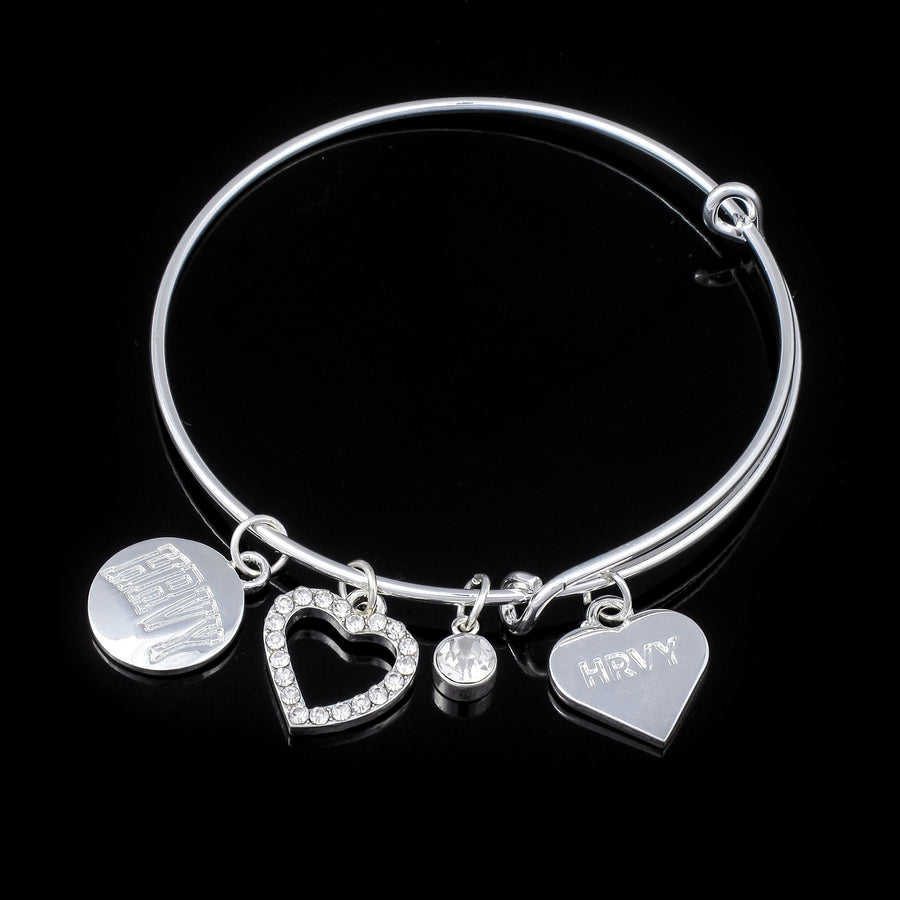 Add a little HRVY sparkle to your wrist with the HRVY charm bangle! The bangle is adjustable and will fit most wrist sizes. It comes with 4 charms - a HRVY heart, a HRVY disc and two sparkling charms.