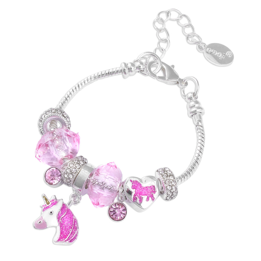 This bright and sparkling bracelet includes charms of all shapes and sizes. The carefully painted unicorn charm sits in the center amongst a variety of pink and sparkling charms. This is the perfect piece for anyone wanting to add a bit of colour and sparkly to their outfit!
