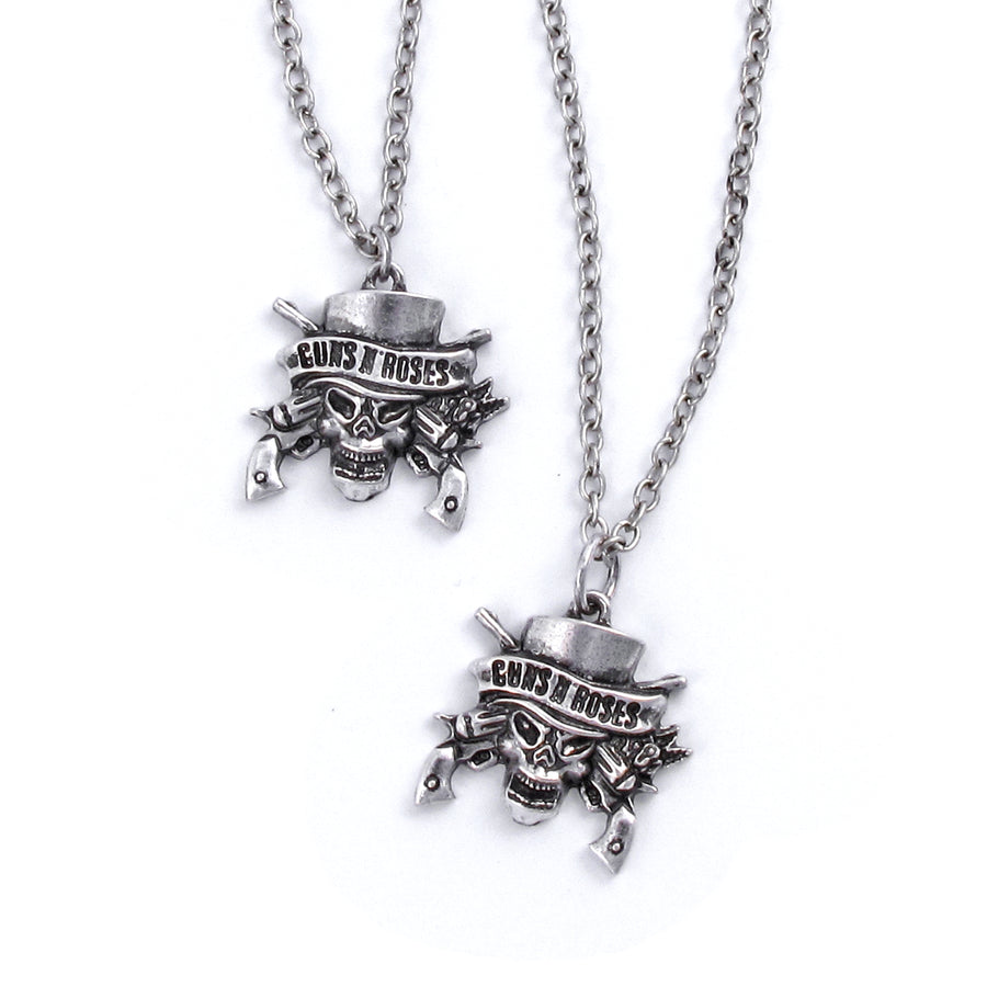 This jewellery set from the official Guns N' Roses range includes a necklace and bracelet. The Guns N' Roses Skull necklace pendant matches the bracelet charm. This product is Antique Silver plated base metal.