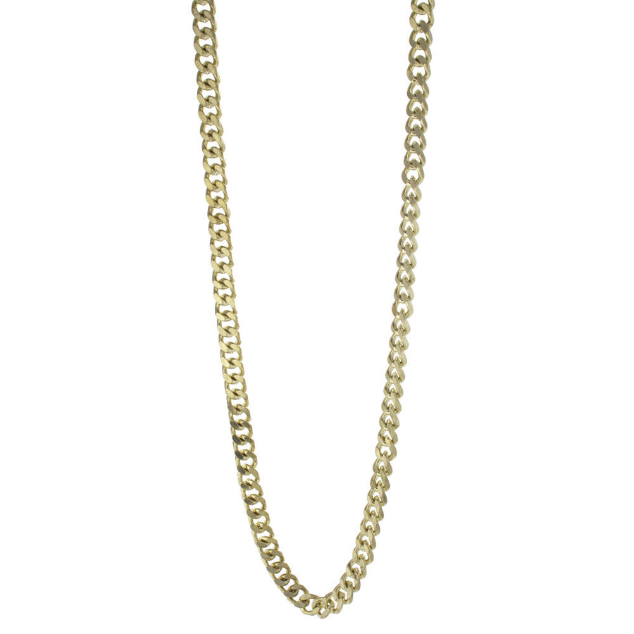 This piece features a chunky heavyweight curb chain with a durable clasp. There is some subtle 'JE' branding on the clasp.