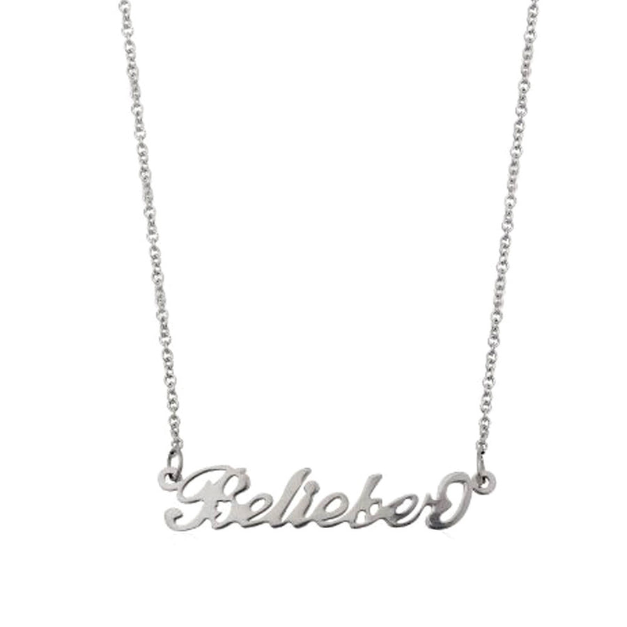 This official Justin Bieber necklace features the 'Belieber' logo as the main pendant.  This comes on a delicate Silver Plated 16 inch chain.