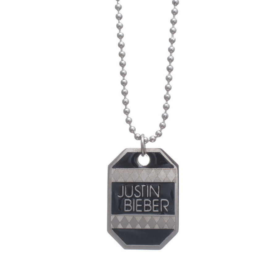 This official Justin Bieber necklace has a the Justin Bieber logo embossed on to the patterned and black enamel dog tag necklace.